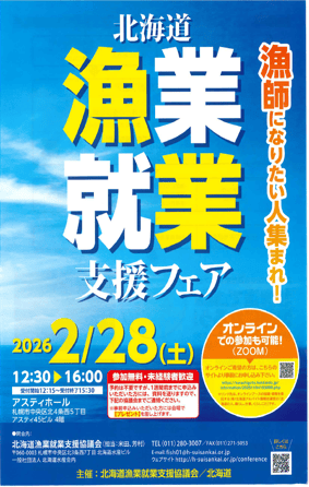 令和8年2月28日(土)には、北海道の各地域から新規の漁業者を求めている漁業者が集まり、ここアスティホールで「北海道漁業就業支援フェア」を12時30分から開催します。